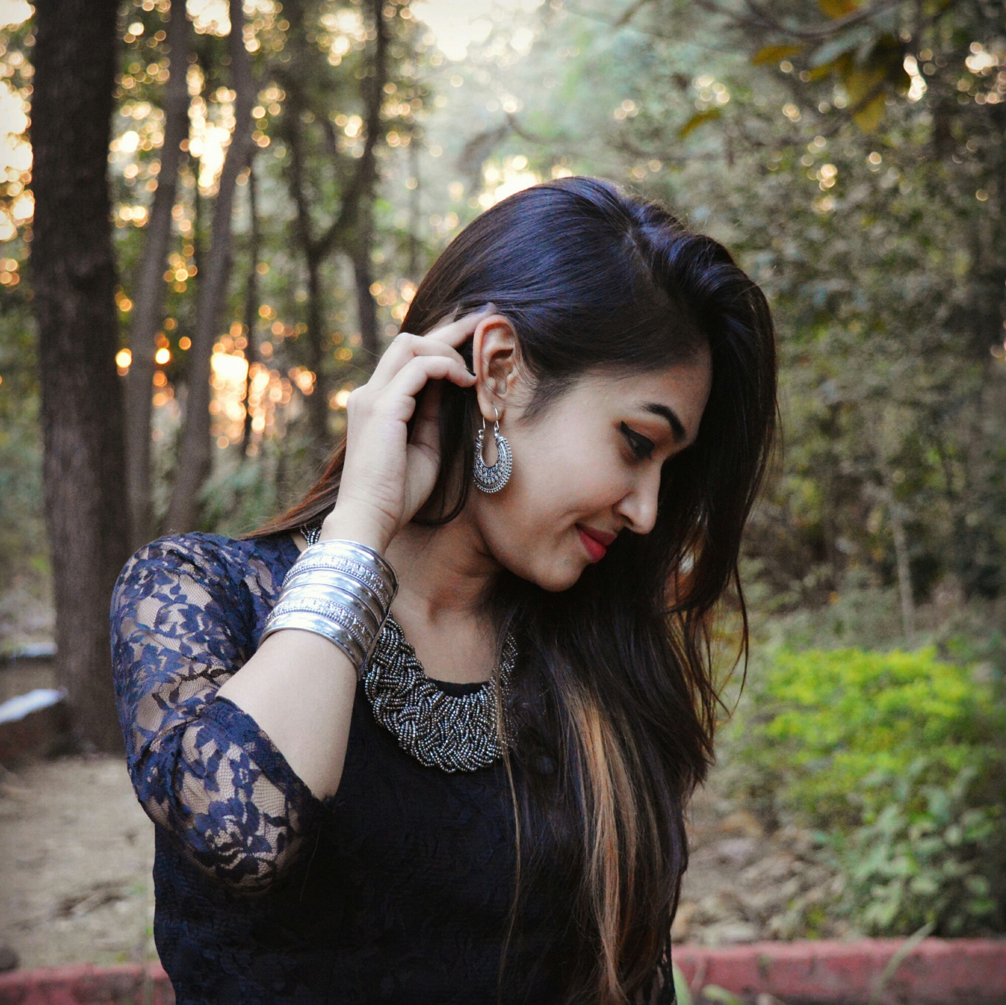 This braided oxidized silver necklace and Boho Deets earrings speak to me on a different level! I added a Gujrati tribal cuff, which never goes out of style, and a maroon lipstick to contrast this look!