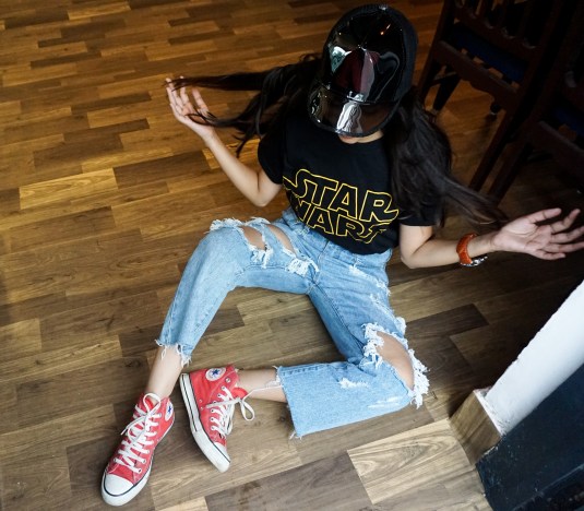 Loose T-shirt and boyfriends jeans, Paired with matching converse sneakers.