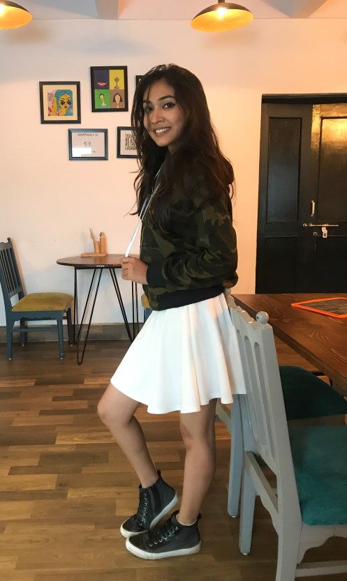 Camouflage jacket with a cute plain skirt looks perfect in the game of contrasting colours.